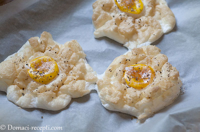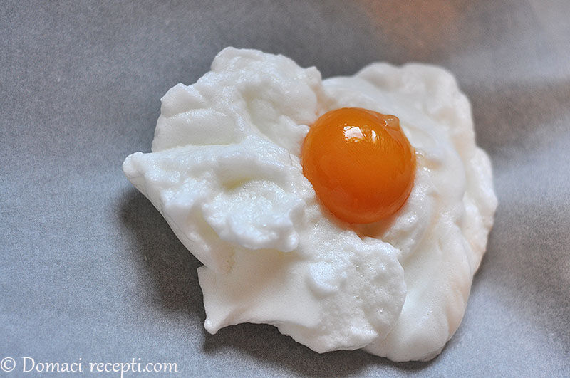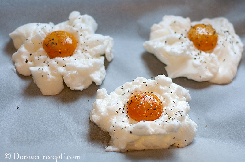 Jaja spremljena na ovaj način najviše će oduševiti mališane. Zanimljivog izgleda i pufaste strukture, obično "jaje na oko" brzo će nestati sa tanjura. Dovoljno je odvojiti žumanjke, a bjelanjke izmiksati u čvrsti snijeg. Na pleh koji smo obložili papirom za pečenje formiramo snijeg u oblik oblačića i na sredinu stavimo žumanjak. Pečemo 7-8 minuta u pećnici na 180 stupnjeva, tj. dok se ne zarumene. Pospemo ih začinima po želji i serviramo za hranjivi doručak.