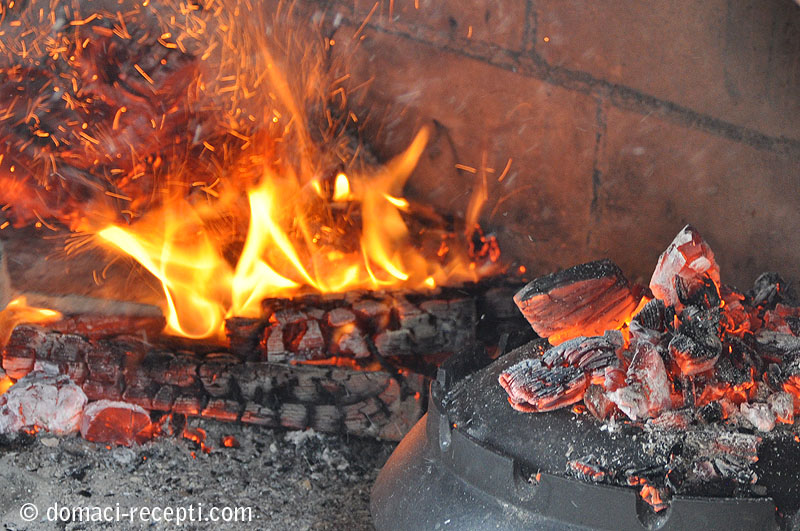 Janjetinu dan prije pripreme dobro nasolimo krupnom morskom soli.Krumpir narežemo na polovice ili četvrtine ovisno o veličini.U peku slažemo prvo narezani luk,krumpir,mrkvu te paradajz i papriku.Posložimo janjetinu koju smo narezali na veće komade, te ostatak krumpira posložimo po mesu.Stavimo malo ulja te peku stavimo u pripremljeni žar.Žar se stavlja ispod peke te slaže po vrhu peke.Pustimo da se peče 1 sat uz dodavanje žara po potrebi. Nakon 1 sata otvaramo peku te podlijevamo bijelim vinom po potrebi.Nakon ukupno 2 sata , ako je bio dobar žar janjac je pečen, po potrebi zapečemo još pola sata .