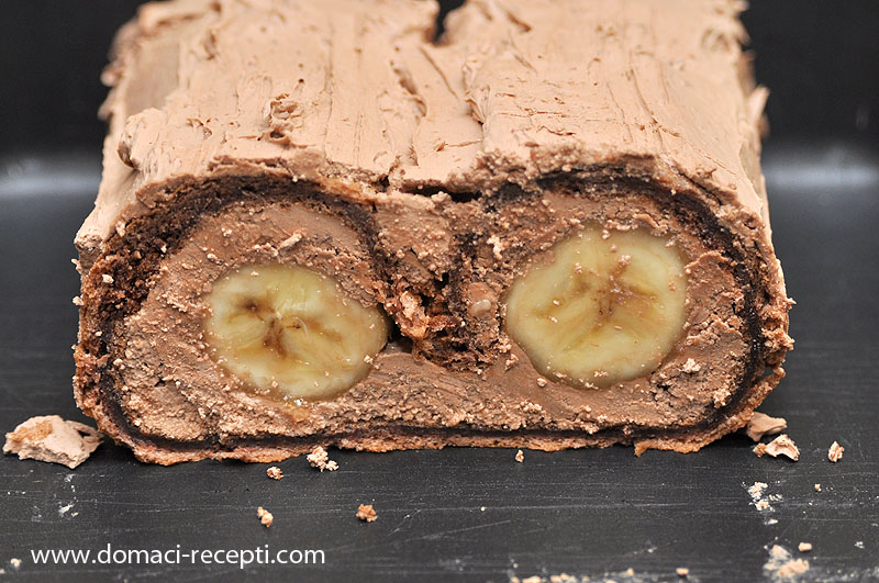 Bananama odrežemo krajeve i složimo jednu iza druge na jedan rub biskvita.
