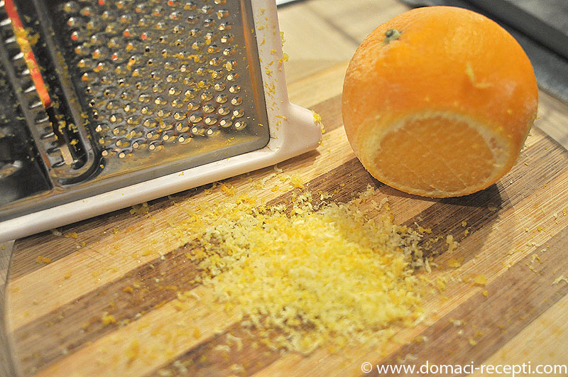 Gornju prerezanu polovicu biskvita izmrvimo.Naribamo 2 smrznute naranče, jednu s korom, drugu bez kore i prelijemo kipućom vodom.Dobro izmiješamo, te dodajemo marmeladu i šećer i sve ponovno izmiješamo.Na donji dio biskvita rasporedimo kremu i prelijemo rastopljenom čokoladom za kuhanje.Odložimo u hladnjak da se ohladi.