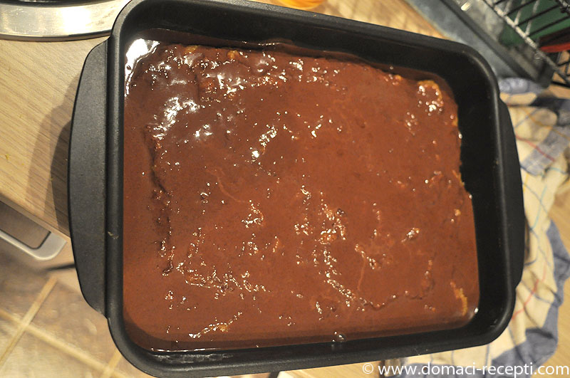 Pjenasto izmiješamo žutanjke i šećer.Lagano miješajući dodajemo brašno u koje smo prethodno umiješali prašak za pecivo.Polagano dodajemo mlijeko, kakao i snijeg od bjelanjaka.Gotovu smjesu izlijemo u pouljenu i pobrašnjenu tepsijui pećemo 20-ak minuta na 180 stupnjeva.Ohlađeni biskvit koncem prerežemo na dva dijela.