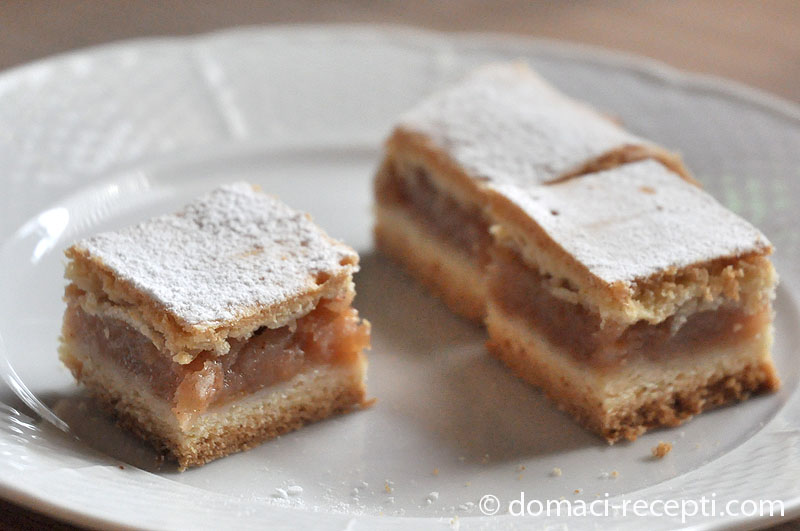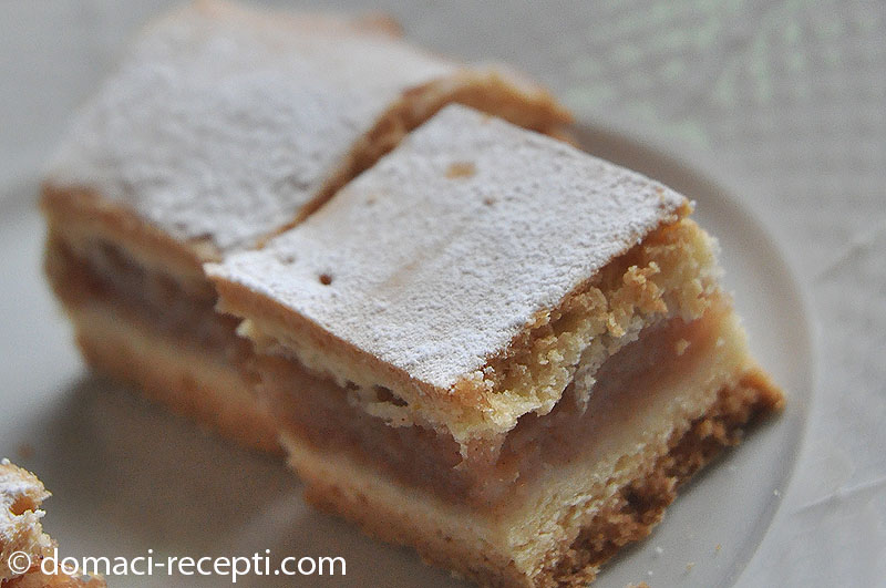 Prvo umijesimo glatko tijesto, zatim ga podijelimo ga na dva dijela te ga ostavimo da da odstoji u hladnjaku barem pola sata. Pripremimo 1kg jabuka koje naribamo, možete koristiti i lošije jabuke koje s pale s jabuke samo ih je potrebno prije očistiti i oguliti.U jabuke (nadjev) dodamo cimet, malo krušnih mrvica, rum i šećer.Prvi dio tijesta razvaljamo stavimo nauljen lim posut s malo brašna te stavimo nadjev na njega. Zatim poklopimo drugi dio tijesta na nadjev.Izbodemo tijesto vilicom.Pitu od jabuka stavimo u zagrijanu pečnicu da se peče na 180°C oko 40-45 minuta.Kad je pita pečena narežite na male komade i posipajte šečerom u prahu.